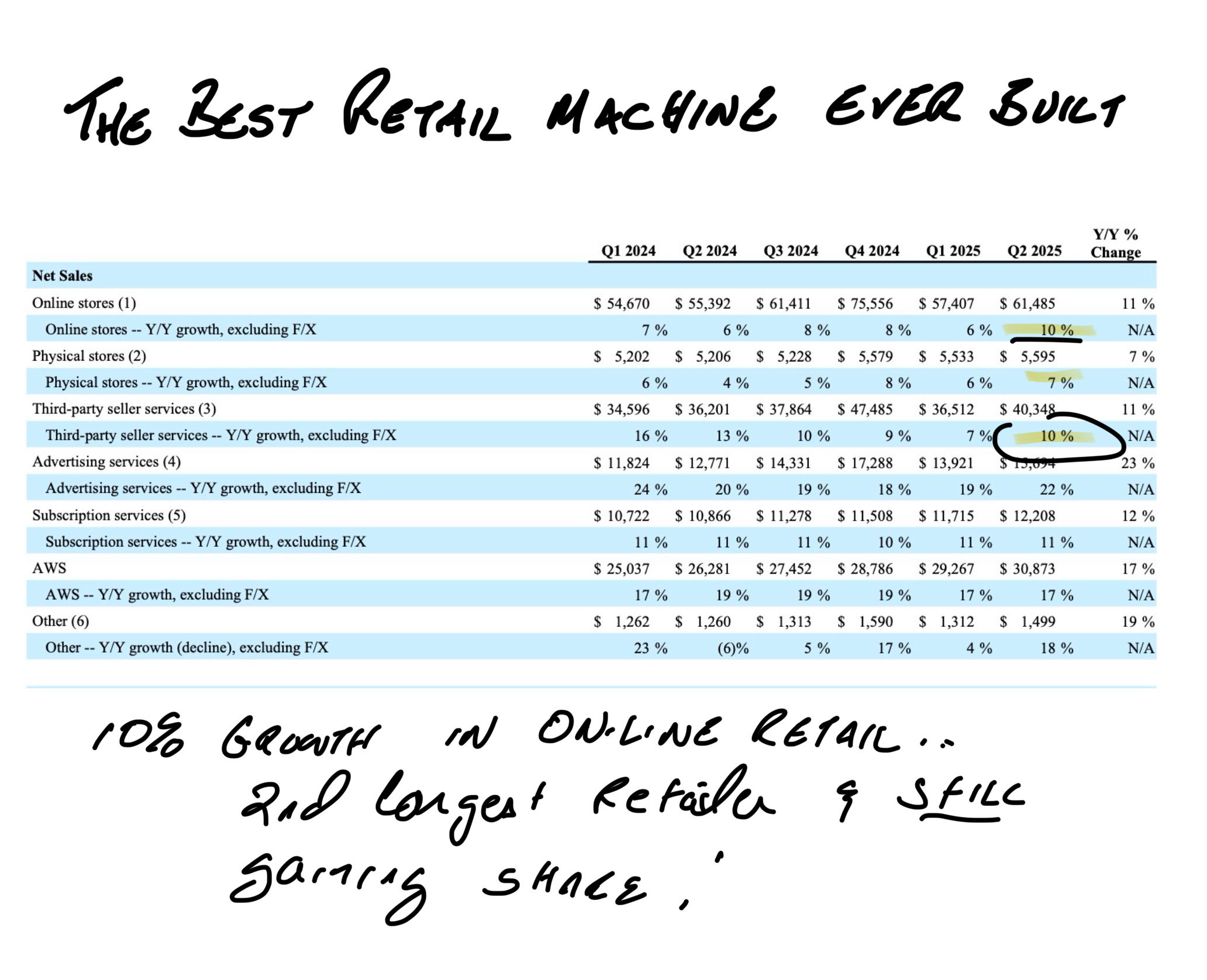 "Subscription Services" (read: Prime) grew 11%. This was before Prime Day. Do you know anyone who doesn't have Prime but is still considering it? I don't. Yet there it is, 6 straight quarters of 10% or more growth in signing up insanely high-profit Prime members. It's the greatest loyalty program since the invention of Sky Miles and gets almost no attention.