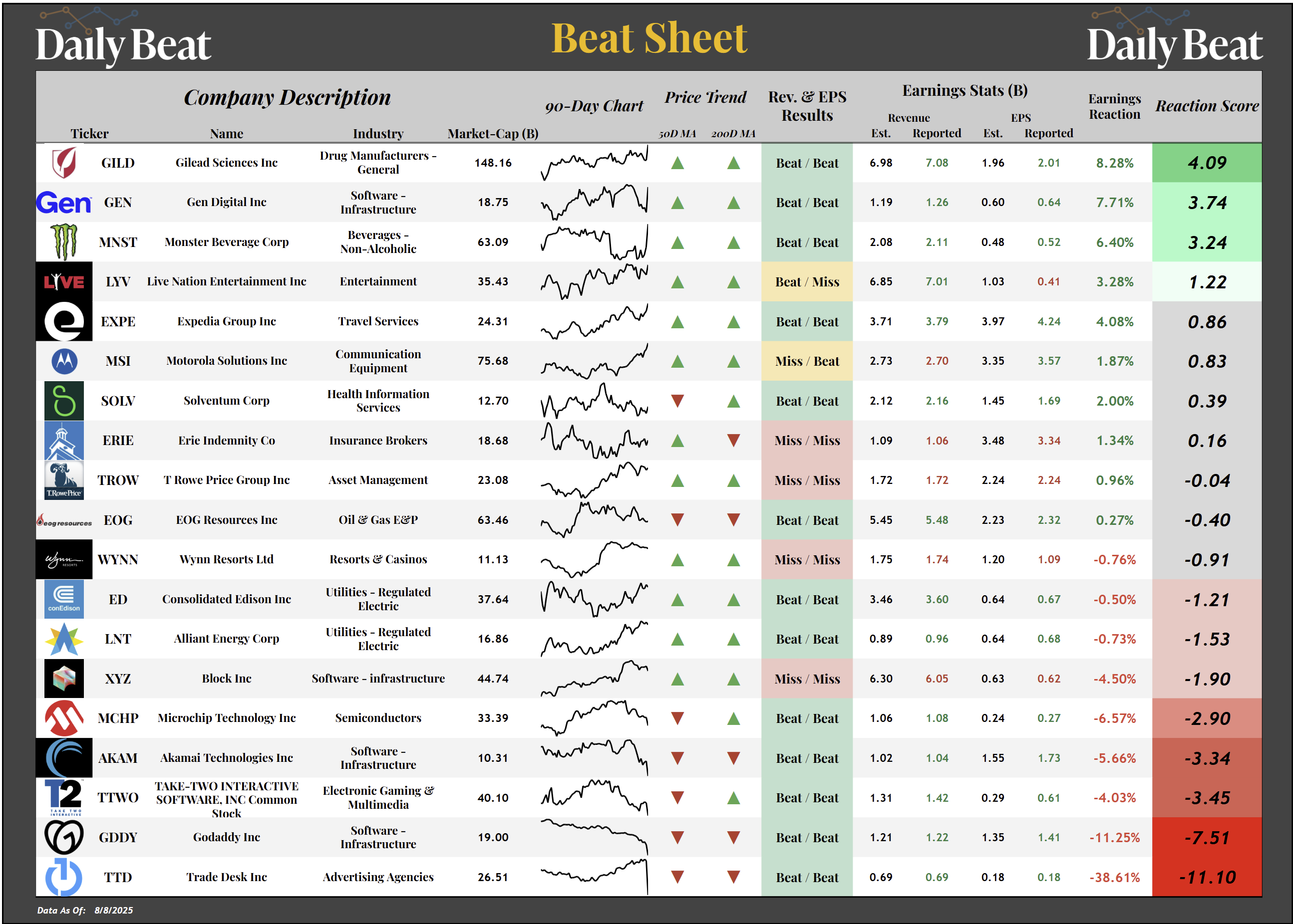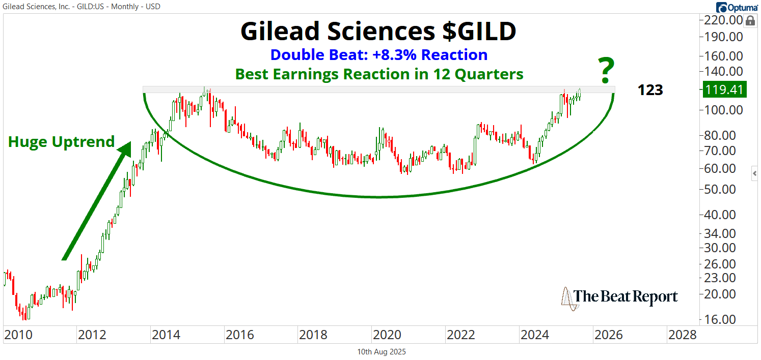 The $150B drug manufacturer known for its HIV drug, Gilead Sciences $GILD, had a +4.09 reaction score after reporting a double beat. This was the best earnings reaction in 12 quarters.