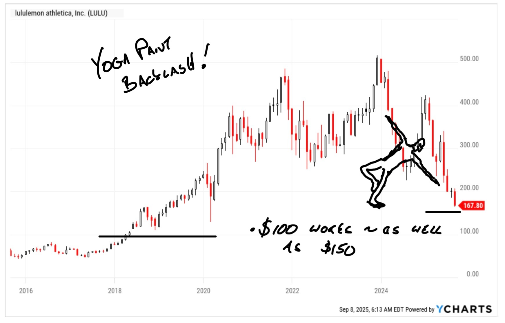 Last week I said I’d buy $LULU at $150. To clarify, that was not a firm commitment. Lulu has been sold consistently for the past six months due to slowing North American sales. There is also a growing backlash against leggings in general.