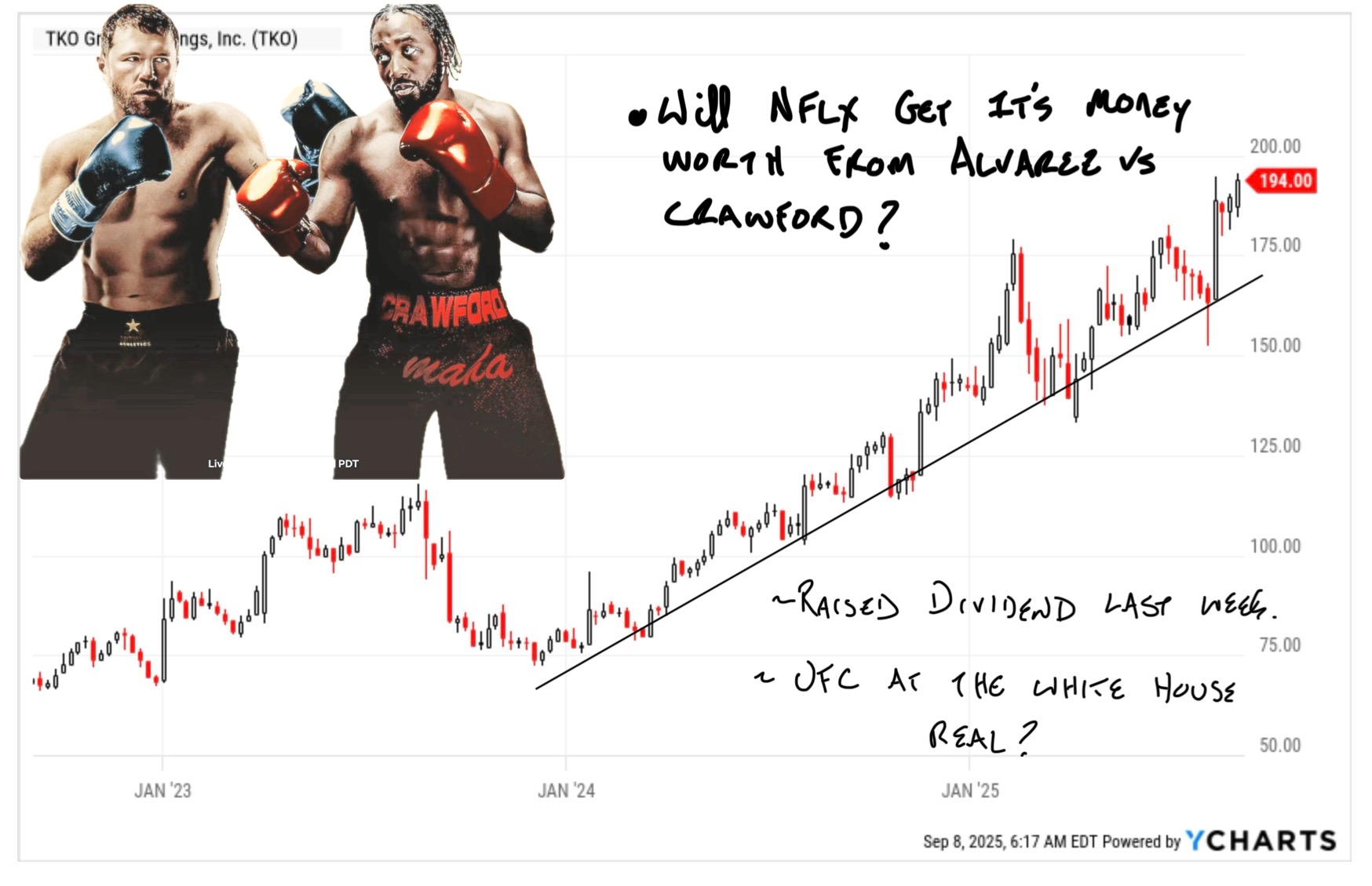 TKO will present at Goldman’s Communicopia event on Wednesday. The stock has gone up because investors expect strong future cashflows from UFC and TKO. Still, it’s not clear if those hopes are realistic. Netflix’s investment in the Alvarez-Crawford fight may depend on international viewers, since boxing’s popularity in the US is uncertain. To judge how TKO and Netflix are doing, we’ll need to see real engagement and revenue numbers after these big fights.