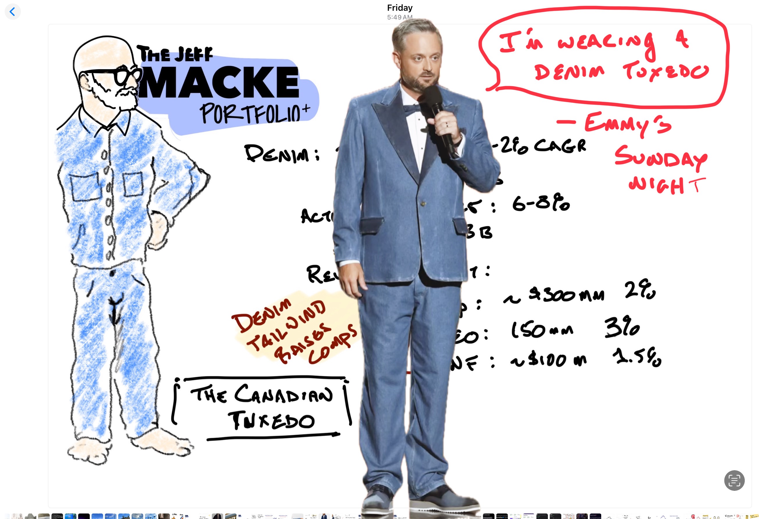 Last week in a Members only Portfolio+ video, I broke down the nuts and bolts of the financials behind the denim trade. I drew myself in the classic Canadian Tuxedo to illustrate the point. Sunday at the Emmy Awards, host Nate Bargatze appeared in what he referred to as a "Blue Jean Tuxedo" to introduce Sydney Sweeney.