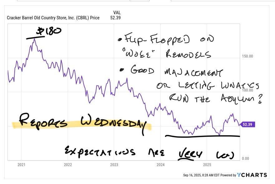 Cracker Barrel and Darden are set to report this week and the set-up isn't great for either. Not only are restaurants as a group starting to roll-over a bit but Cracker Barrel just spent 6 months rolling out "Inclusive" store redesigns when quickly reversing the decision in the face of public pressure.