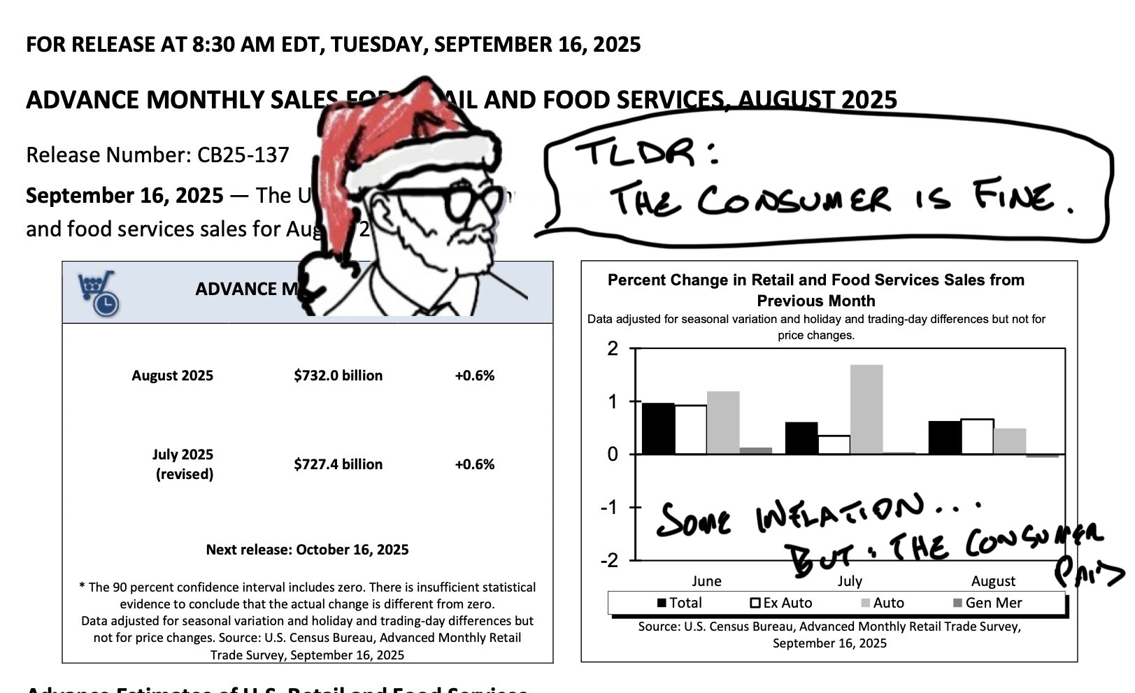 Government retail sales just came in slightly hotter than expected. Some of this might be inflation. Tariff-plagued sporting goods and apparel were both strong. Then again, so were grocery sales, where tariffs are less of a factor.