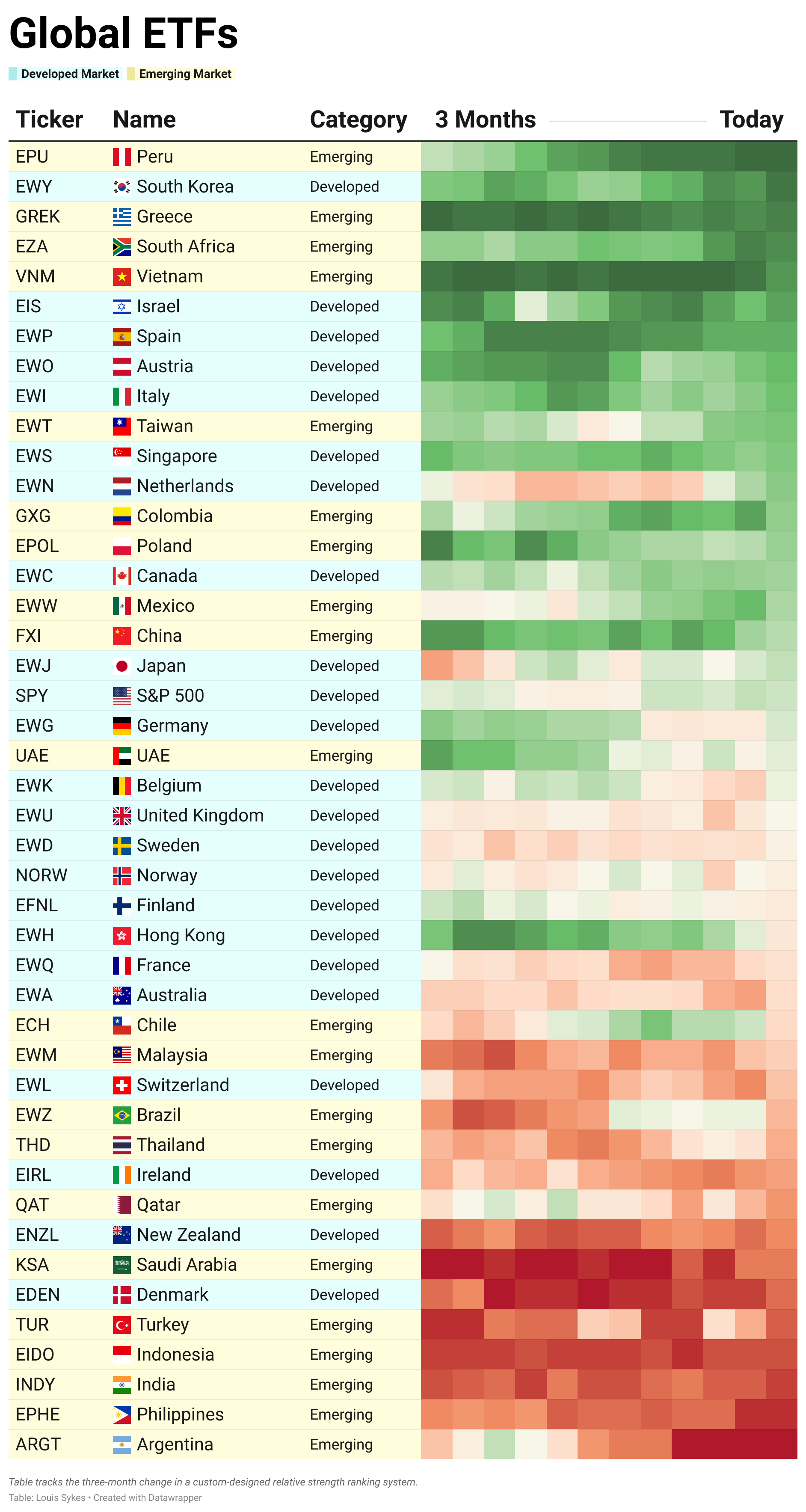 More recently, however, the Milei government has faced political setbacks and the Argentinian market has stumbled alongside it. The ARGT ETF has broken to new lows and now ranks as the weakest on our list.