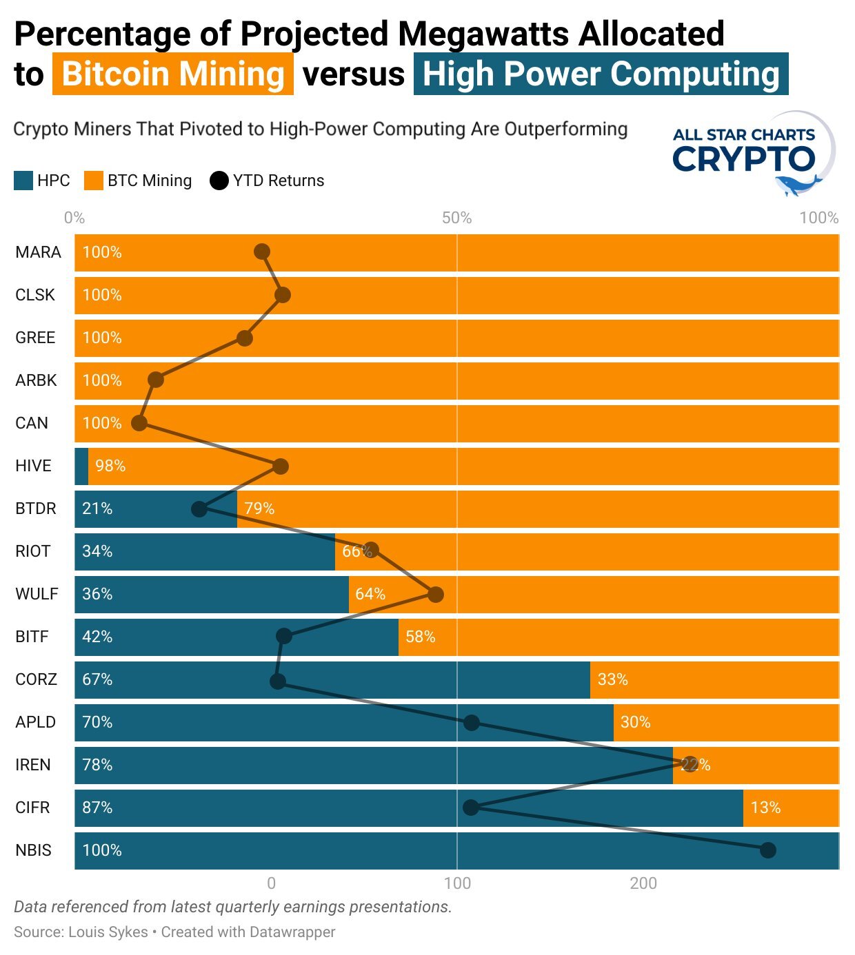 Companies like Marathon Digital $MARA and CleanSpark $CLSK remain pure Bitcoin miners. As the chart shows, nearly 100% of their projected megawatts are still tied to Bitcoin, and their year-to-date returns have lagged the field.