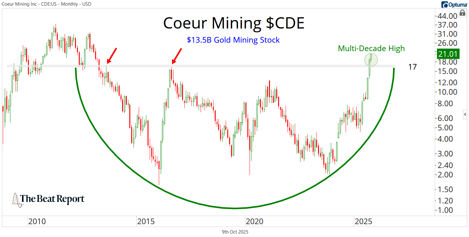 Coeur Mining just broke out from a multi-decade base, completing a massive bearish-to-bullish reversal and entering a brand-new primary uptrend.