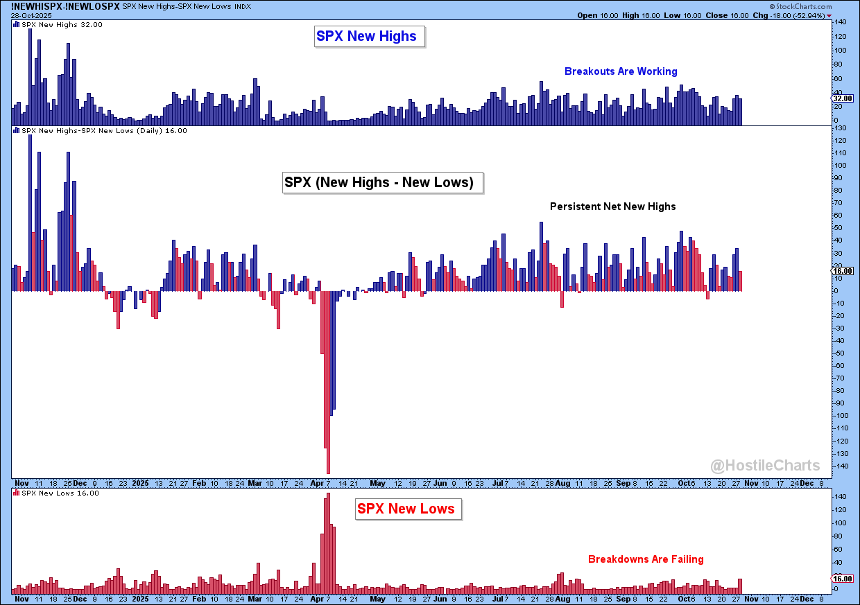 Thompson's Two Cents The Rule vs. The Exception A Bull Market Chart By Larry Thompson October 28, 2025 When you study markets long enough, you realize the most valuable lessons are worth repeating.And one of those lessons is this: Data is Everywhere.We’re surrounded by it. Everything from the economy to the number of steps you take before lunch now gets quantified.Because of that, at any given time, in any market environment, you can find data to support how you feel.Bullish? There’s a stat for that!Bearish? There’s one for that too!But the skill isn’t in shouting the most data the loudest.It’s in analyzing its behavior to separate noise from knowledge.The difference between noise and knowledge is knowing what’s typical and what’s not.What’s the rule, and what’s the exception?The rule is that it’s sunny in California.The rule is that Michael Jordan makes his free throws.The exception, as we know, is just that — an exception.It doesn’t deserve an overreaction, because good analysis helps us see it for what it is.Bull Markets have rules too.One of my favorites? New highs consistently outnumber new lows.Yet most people focus on the exception.They cherry-pick a handful of new lows and shout “recession,” or highlight a few new highs and declare “the bears are wrong again.”That’s not analysis. That’s data manipulation to validate emotions. Right now, the rule is clear: new highs continue to outnumber new lows.Not for one day or one week....but for the entire recovery off the April lows.That tells us buying breakouts is working and selling breakdowns is failing.It tells us markets are rewarding strength and defending weakness.That’s what healthy markets do. That’s the rule.So if an exception pops up, we treat it as one until persistent data suggest otherwise.And when that day comes, we’ll adapt.But not before the rule becomes the exception.Because good analysis can spot the difference.Anyways, that’s my two cents. More from Thompson's Two Cents Larry Thompson The Sunday Stalk List | Ep. 21 A "SHOW ME" Market November 2, 2025 Larry Thompson Bitcoin Looks Spooky The 4 Warning Signs October 30, 2025 Larry Thompson Don't Buy Fear I Got A Better Idea October 16, 2025 Sign Up TodayGet expert market insights delivered straight to your inbox. You must have JavaScript enabled to use this form. Email Address