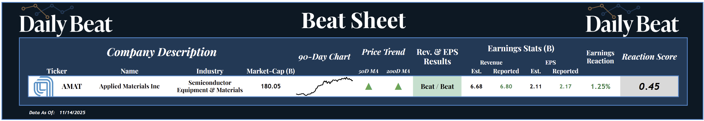 Friday's only beat came from Applied Materials $AMAT, the $180B semiconductor equipment and materials stock. The company beat expectations across the board, and shareholders were rewarded with a +0.45 reaction score.