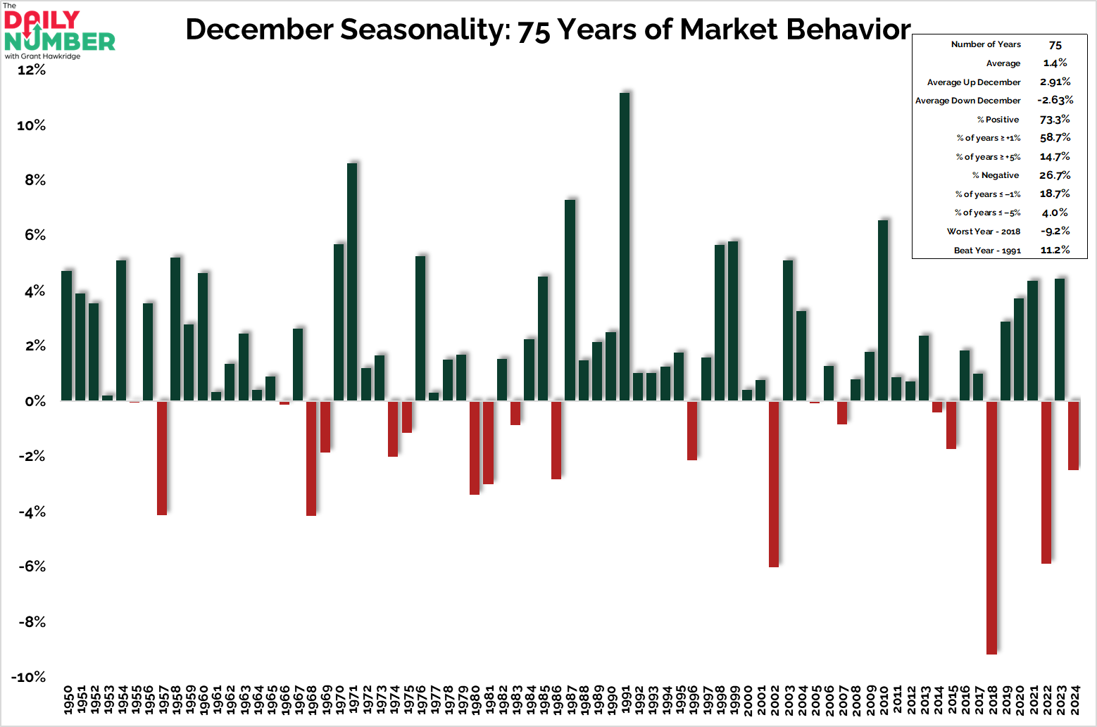 Down years are less common. Only 26.7% of Decembers have finished red, and the average down month is 2.6%. The negative side of the curve exists, but it plays a smaller role in the long record.