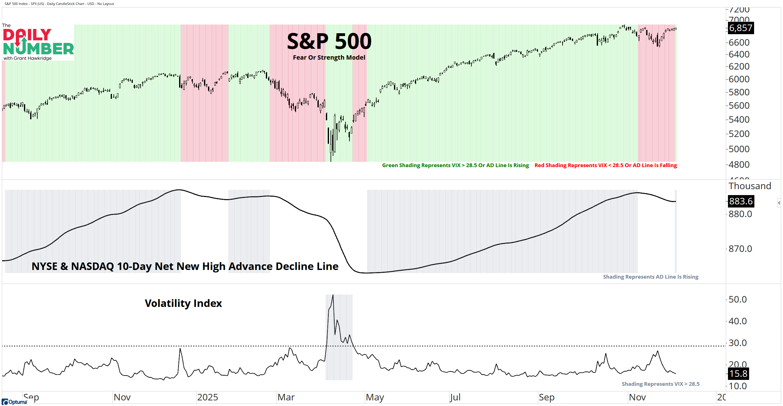 The bottom section displays the Volatility Index as a black line. Gray shading appears when the VIX reads above 28.5.