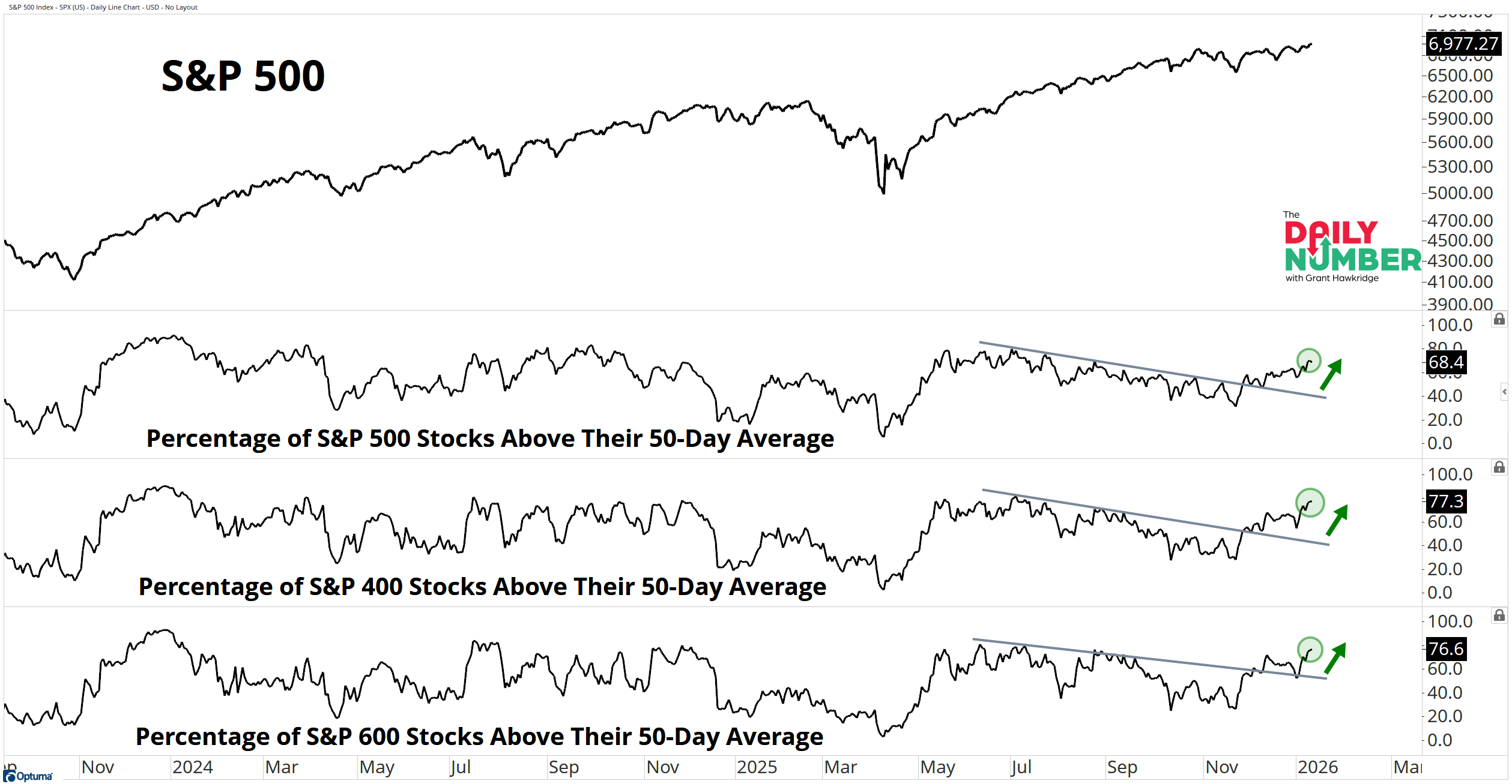 Roughly 70% of stocks across large, mid, and small caps are now above their 50-day moving averages.