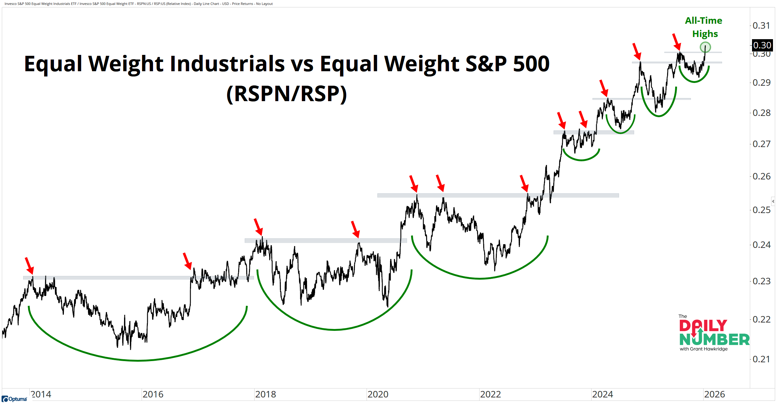 Equal-weight Industrials just pushed to a new relative high versus the equal-weight S&P 500.