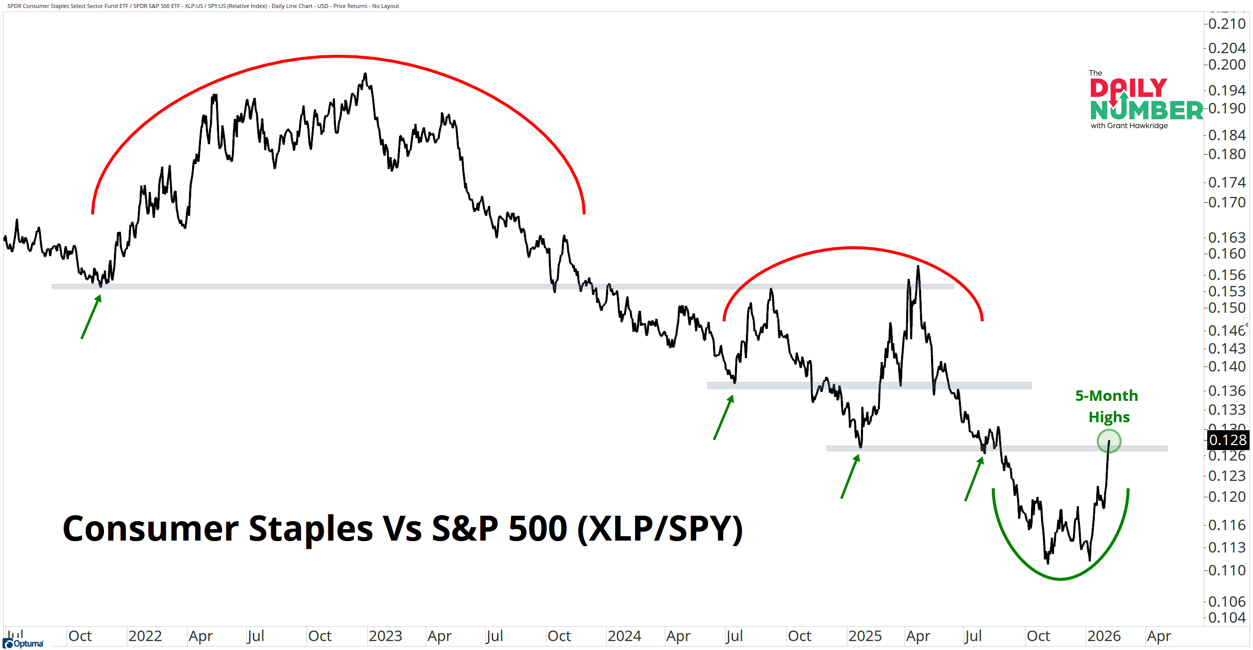 Consumer Staples versus the S&P 500 just hit a 5-month high.